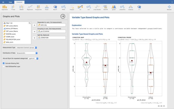 Jamovi also has free modules (like R’s packages) that can be installed to unlock new capabilities. For instance, modules like JJStatsPlot can be installed to produce fantastic data visualizations with the click of just a few buttons.